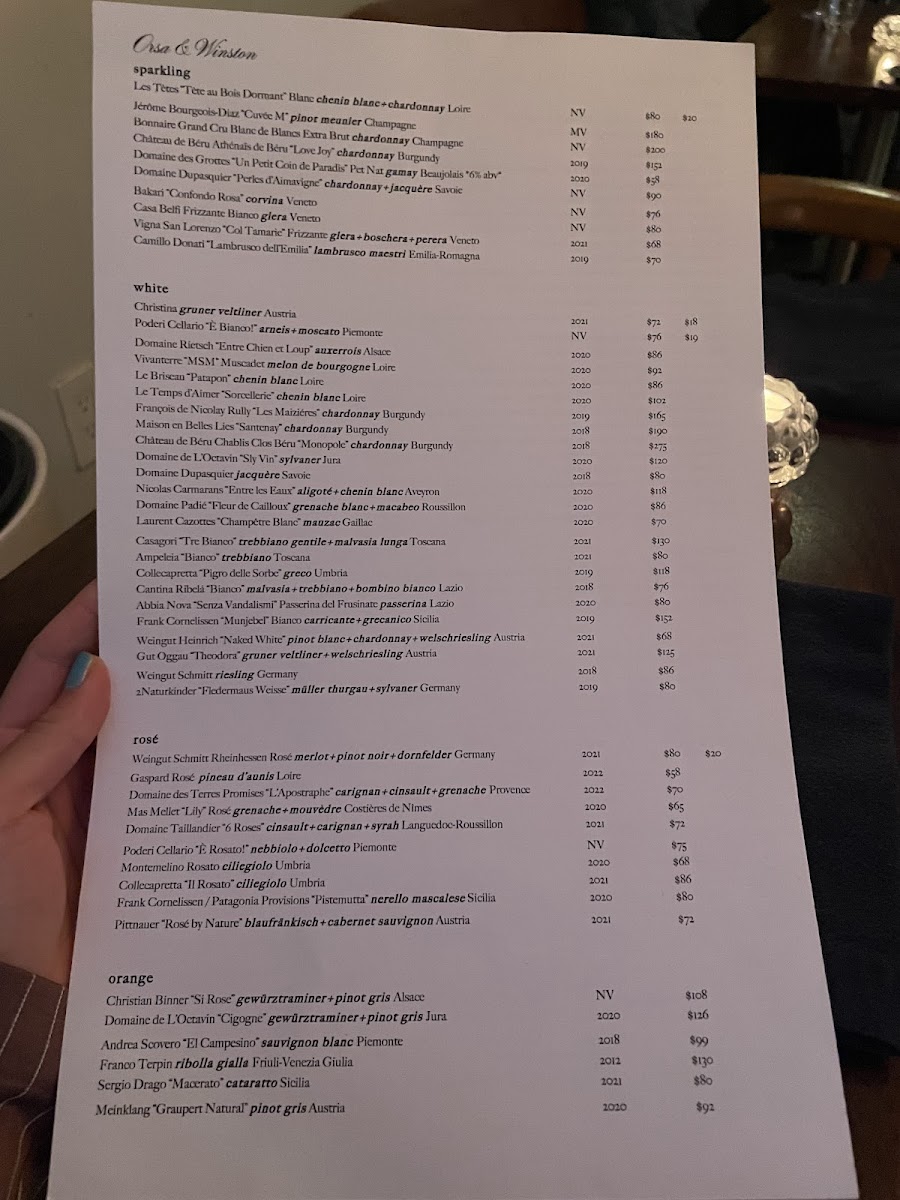 Upon entering Orsa & Winston, guests are greeted by a minimalist yet classy decor, an ambiance that effortlessly melds casual elegance with sophistication. The intimate setting complements the restaurant's commitment to providing a unique and personal dining experience, making it perfect for special occasions or simply indulging in a remarkable meal.